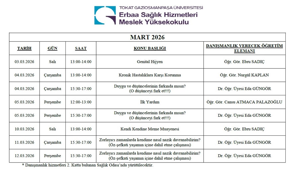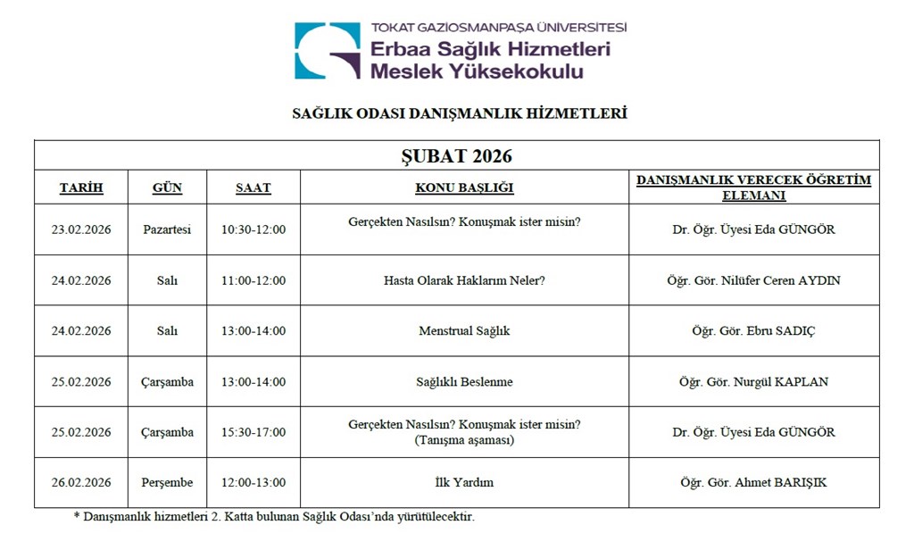 ERBAA SAĞLIK HİZMETLERİ MESLEK YÜKSEKOKULU ŞUBAT–MART 2026 DANIŞMANLIK PROGRAMI BAŞLIYOR!